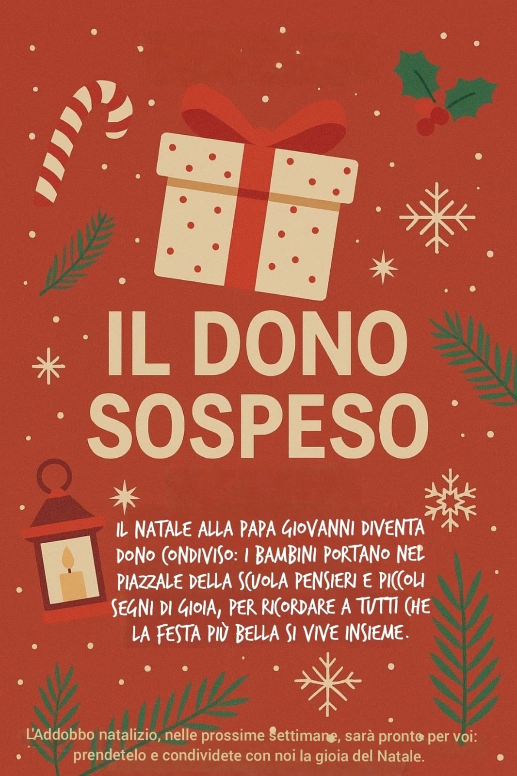 08:00 - ✨ A partire dal 9 dicembre, e per le due settimane successive, i bambini – guidati dai loro insegnanti – trasformeranno il piazzale in uno spazio di festa e solidarietà, arricchendolo con i tanti e variegati “doni sospesi” realizzati con creatività e cura.